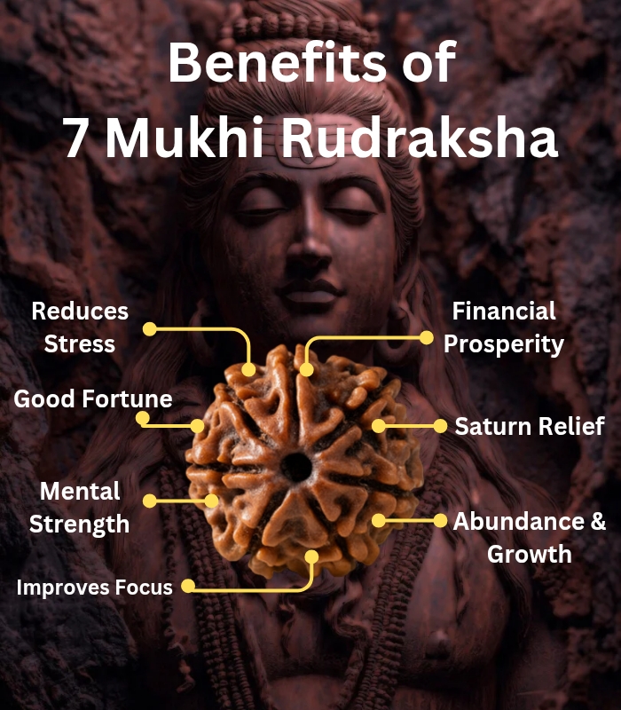 The seven natural mukhis (lines) of the Rudraksha symbolize seven life channels through which energy flows—wealth, wisdom, protection, discipline, emotional balance, effort, and grace.