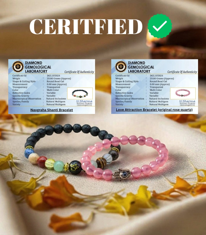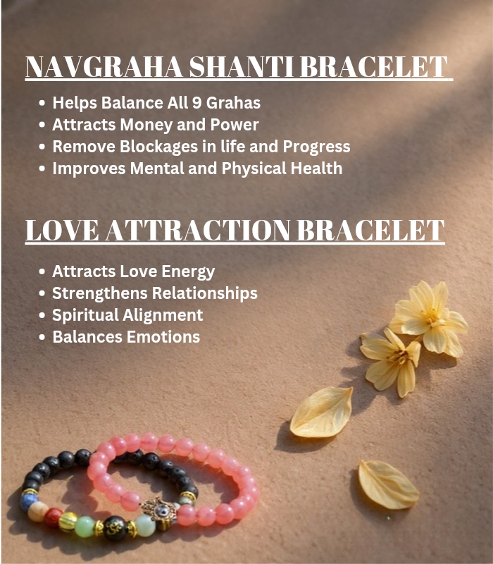 The Navagraha Shanti & Love Attraction Crystal Combo is a powerful trio designed for total life balance—planetary harmony, emotional healing, and attraction of meaningful relationships. This combo includes an Energized Navagraha Shanti Bracelet, an Original Rose Quartz Love Attraction Bracelet, and a FREE Selenite Charging Plate, making it a holistic solution for both spiritual alignment and emotional fulfilment.