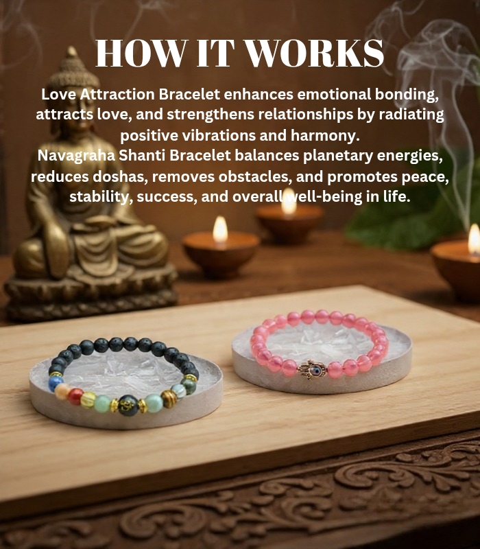 The Navagraha Shanti Bracelet supports planetary balance and stability in health, career, finances, decisions, mental peace, and life direction as per astrology. The Love Attraction Bracelet, made with 100% Original Rose Quartz, is regarded as the stone of love, compassion, self-worth, and emotional balance—ideal for attracting love and strengthening existing bonds. The Selenite Plate naturally cleanses and recharges both bracelets, ensuring they stay energetically active and positive.