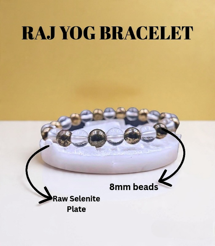 The Raj Yog Bracelet (Golden Pyrites & Sphatik) is a powerful spiritual accessory designed to awaken royal energy, leadership qualities, and divine favor in the wearer’s life. Inspired by the concept of Raj Yoga in Vedic astrology—a combination associated with success, authority, recognition, and prosperity—this bracelet blends the grounding power of Golden Pyrite with the purifying clarity of Sphatik (Crystal Quartz).